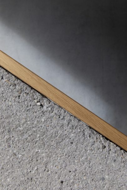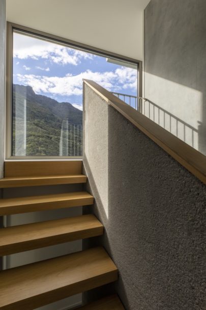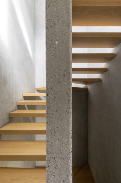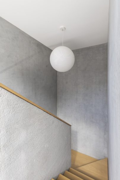 • All’interno della casa, la scala che collega i vari piani è realizzata in gradini di legno di rovere e si sviluppa tra due muri di cemento a vista.