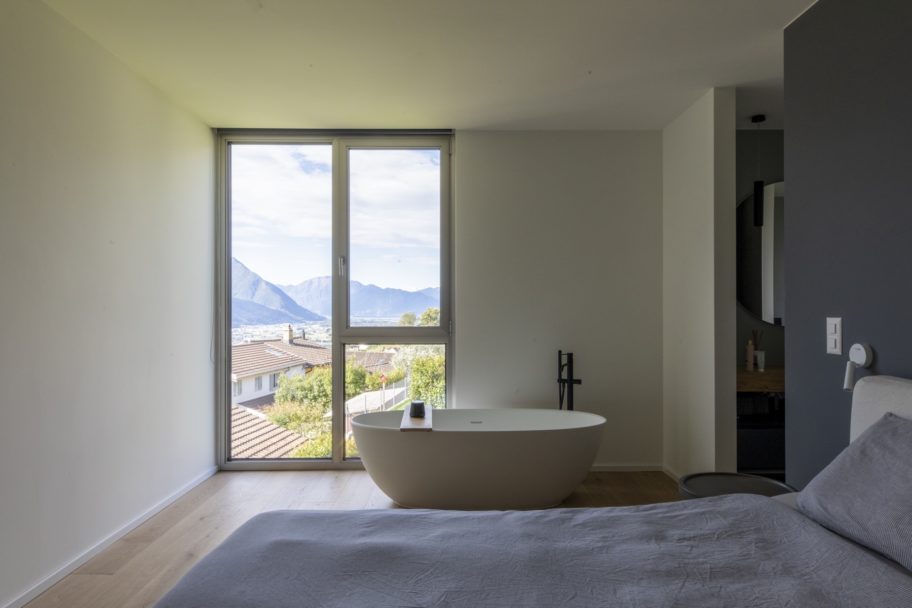 Al piano primo si trova la camera padronale dotata di cabina armadio e sala da bagno dedicata, cui si aggiungono uno studio e un bagno di servizio. La camera padronale accoglie una vasca free standing da cui si gode di una straordinaria vista su lago Maggiore.