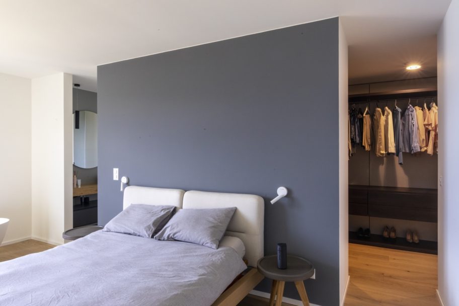 Alle spalle del letto, una parete separa bagno e cabina armadio aumentando lo spazio percepito nella stanza.
