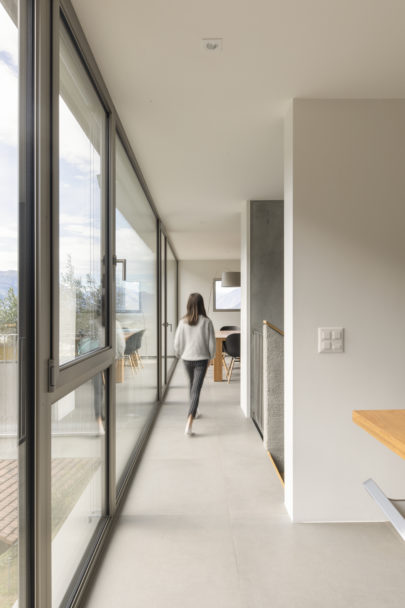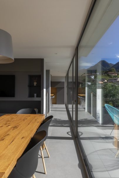 Al secondo piano si trovano l’ingresso principale alla casa e la zona giorno che si configura come un vero e proprio open space attorno ad un blocco centrale che separa la zona living dalla cucina e contiene la scala, gli arredi funzionali del soggiorno, il guardaroba e un camino. Tutto si affaccia con una grande vetrata di 12 mt a tutta parete sui suggestivi rilievi delle Prealpi ticinesi.