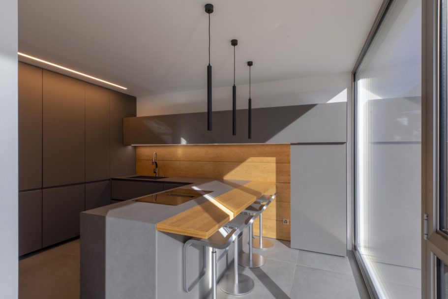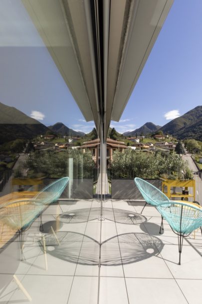 • A livello della zona giorno, un ampio balcone – orientato a sud – riprende nei suoi parapetti l’estetica della passerella che fa da ponte verso l’ingresso