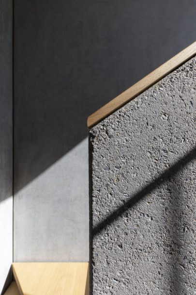 • Così come è in cemento a vista sabbiato il muro centrale della scala, ad esaltarne la matericità.