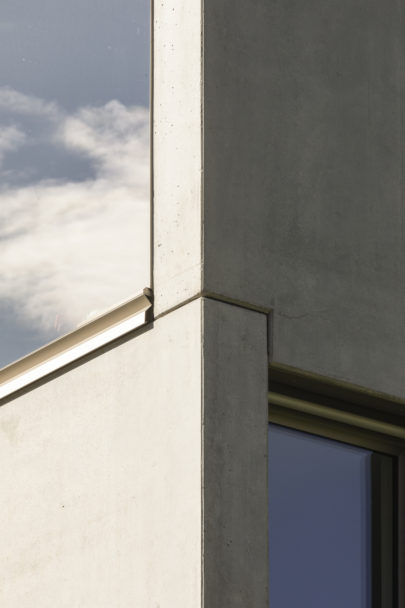Le aperture sfalsate su ogni piano creano un gioco di pieno-vuoto alternato in facciata. I muri sono in cemento faccia-vista, di colore grigio chiaro, mentre i pannelli tra le finestre sono eseguite in cemento di tonalità grigio scuro così da sottolineare il gioco di pieno-vuoto. Il dettaglio dell’incastro degli elementi all’angolo è stato risolto in modo da raccontare la logica tettonica della costruzione prefabbricata.