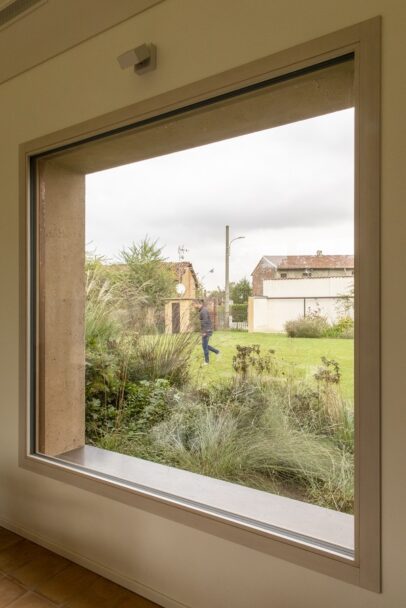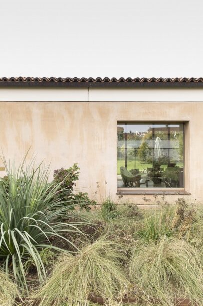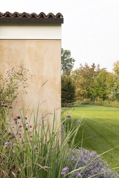 L’ingresso della casa dialoga con il muro della cascina oggetto di demolizione creando un diaframma in cui il giardino ispirato alle realizzazioni del grande paesaggista Piet Oudolf è il vero protagonista.
