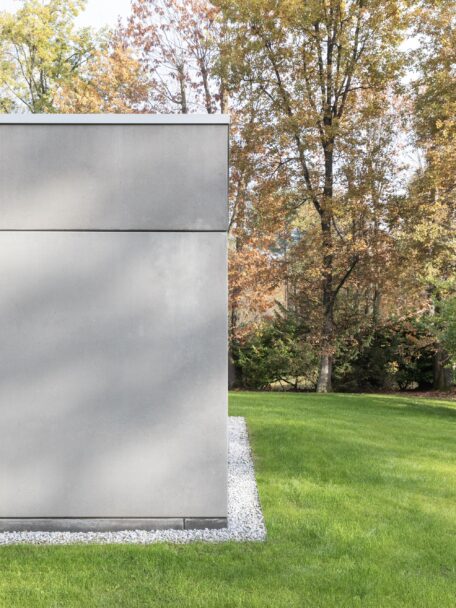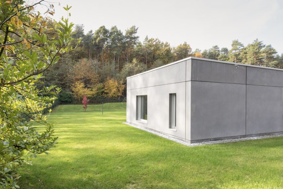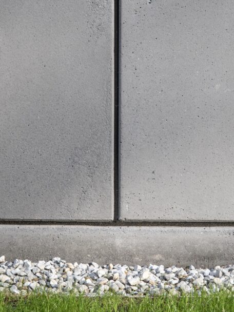 Le pareti in cemento faccia – vista grigio creano contrasto con il verde, che si accentua quando l’edificio è bagnato dalla pioggia.