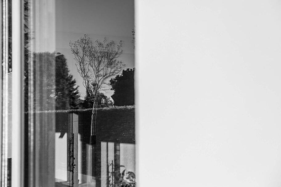 La casa è composta da due blocchi principali, uno dei quali è dedicato agli spazi più intimi della vita domestica. Questi volumi monolitici racchiudono uno spazio centrale, caratterizzato da un soffitto alto e ampie vetrate che inondano gli interni di luce naturale. Questo spazio diventa una vera e propria estensione della casa, aprendo l’ambiente verso l’esterno, ma rimanendo al contempo protetto grazie alla siepe che avvolge il giardino da un lato e alla casa che lo delimita dall’altro.