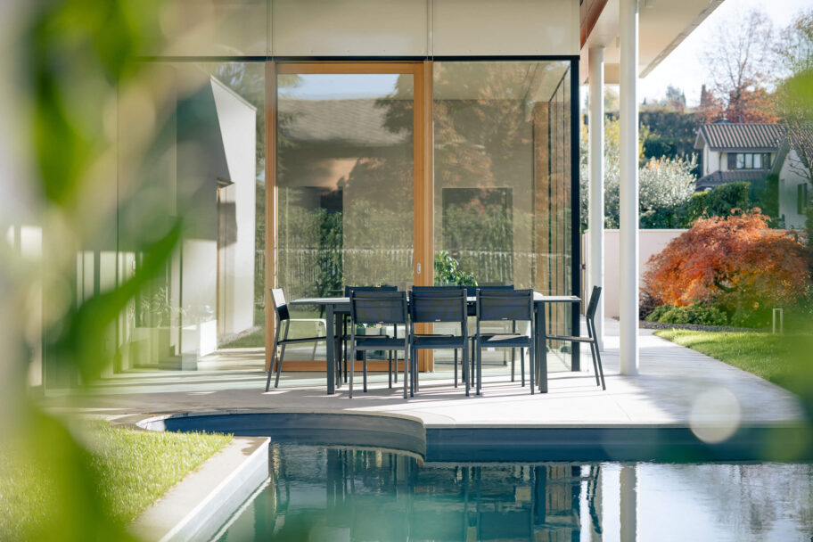 Il progetto architettonico si distingue per la sequenza fluida degli spazi, che si sviluppano dall’interno verso l’esterno. Gli ambienti si aprono gradualmente, passando dagli interni raccolti a spazi più ampi e luminosi, culminando in un portico che si affaccia su uno specchio d’acqua.