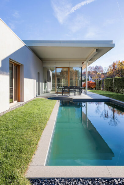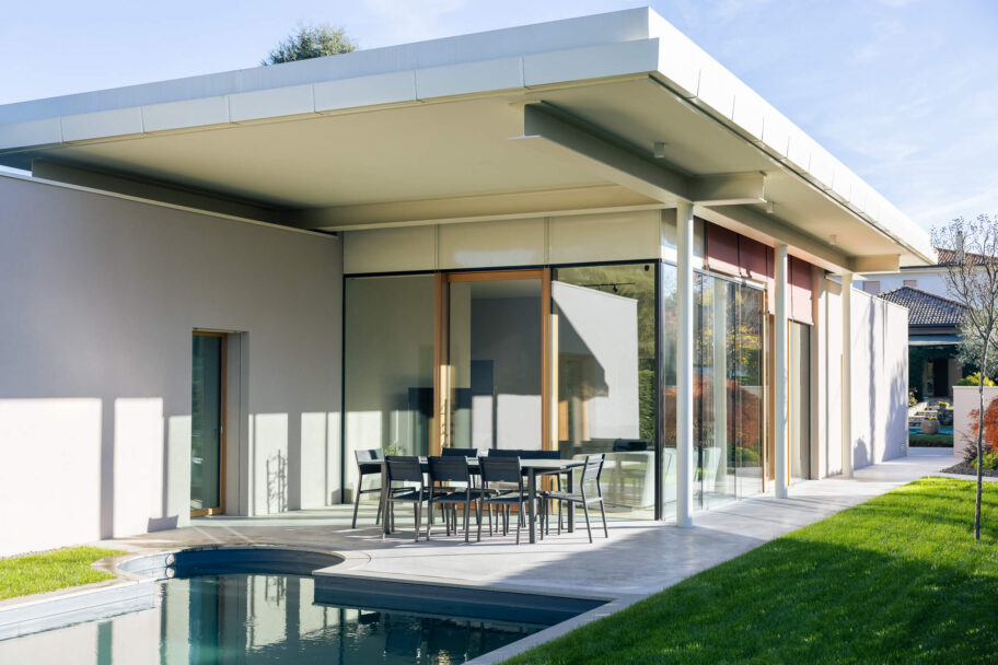Per rispondere alle nuove esigenze, la casa è stata riprogettata completamente su un unico piano. Questa scelta non solo ha permesso di garantire la massima privacy e di mantenere un dialogo costante tra gli spazi interni ed esterni, ma ha anche avuto un impatto positivo sul contesto circostante. Il valore della riqualificazione sta infatti nel fatto che, riducendo l’altezza della casa da tre piani a uno, l’edificio risulti meno invasivo come impatto visivo per il quartiere stesso. Il giardino, che prima era quasi inesistente poiché occupato dall’abitazione, è stato sapientemente ricavato grazie a una progettazione accurata è ora parte integrante di una corte interna protetta dalla siepe da un lato e dalla casa dall’altro, diventando uno spazio esterno intimo e accogliente. La nuova abitazione rappresenta una sintesi perfetta di protezione e apertura, dove gli ambienti si sviluppano orizzontalmente, stabilendo un legame diretto con il giardino circostante.