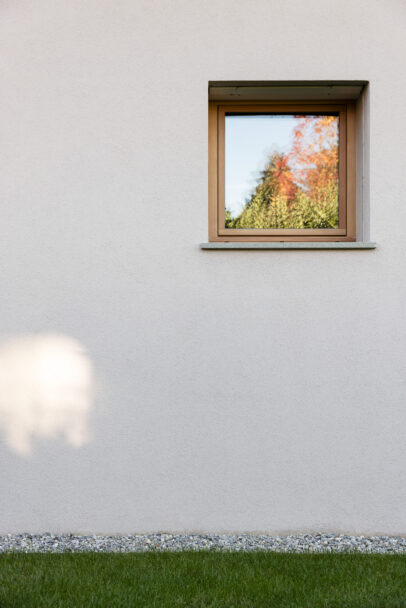 I serramenti, realizzati in pregiato legno di rovere, sono stati progettati per scomparire visivamente: le parti fisse della vetrata sono prive di profili visibili, creando un effetto di continuità tra interno ed esterno. Questa soluzione permette di leggere le superfici vetrate come campiture uniche, in cui la trasparenza e la leggerezza dominano.