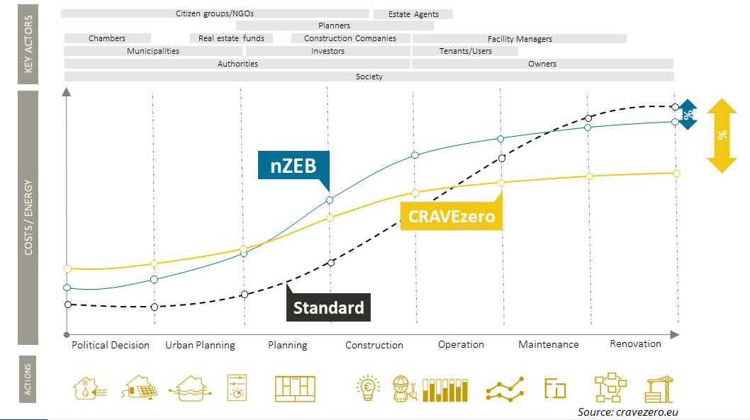 CRAVEzero focuses on proven and new approaches to reduce the costs of Nearly Zero Energy Buildings (nZEBs) at all stages of the life cycle. The main goal is to identify and eliminate the extra costs for nZEBs related to processes, technologies, building operation, and to promote innovative business models taking into account the cost-effectiveness for all the stakeholders.